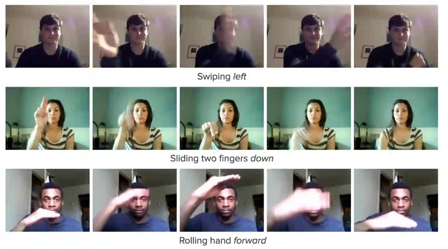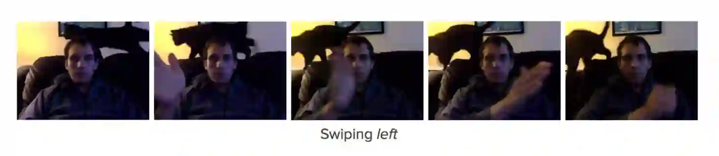 这个数据集包括 148,092 个标注视频片段,每一个时长 3 秒左右。这些视频涵盖了 25 个类别的人类手势和两个「无手势」的类别,从而来帮助网络结构对特定手势动作和未知手部动作进行区分。这些视频展示了人类行为者在网络摄像机面前完成各种一般的手势的过程,比如「向左或向右重击」,「两个手指向上或向下滑动」,「向前或向后摆手」。从视频中预测这些文本标注通常要求网络能够理解这些概念,比如三维空间的自由度(震荡、摇摆、举起等等)。