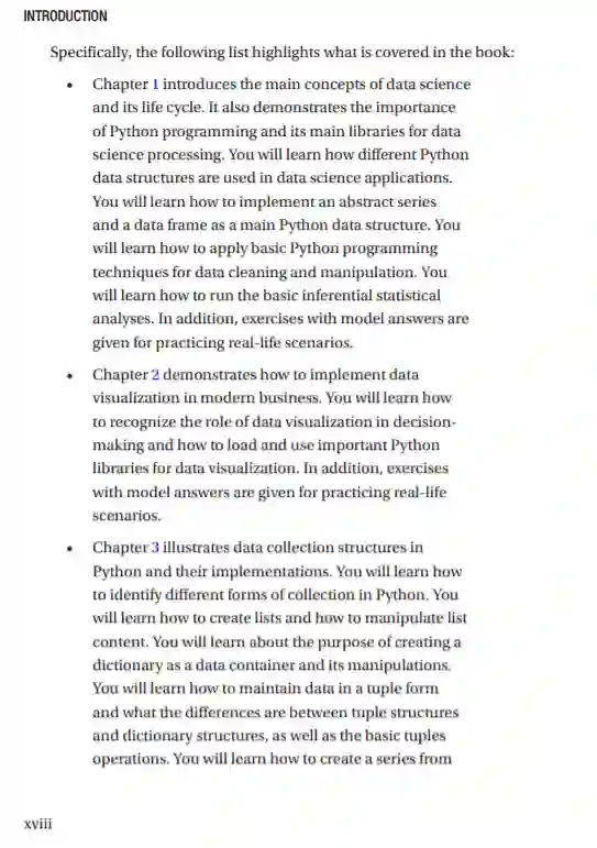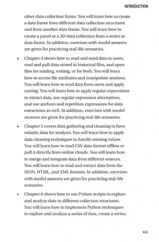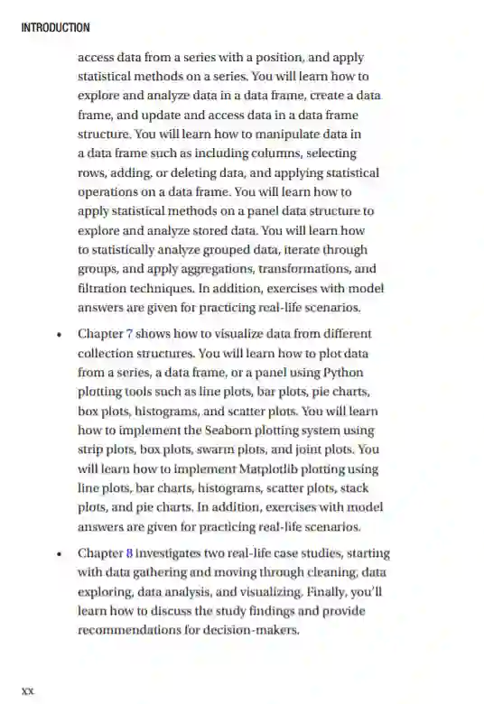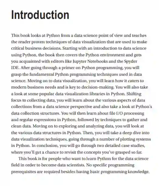 将重点转移到数据结构,您将从数据科学的角度了解数据结构的各个方面。然后使用Python处理文件I/O和正则表达式,然后收集和清理数据。继续探索和分析数据,您将看到Python中的高级数据结构。然后,您将深入研究数据可视化技术,了解Python中的许多绘图系统。