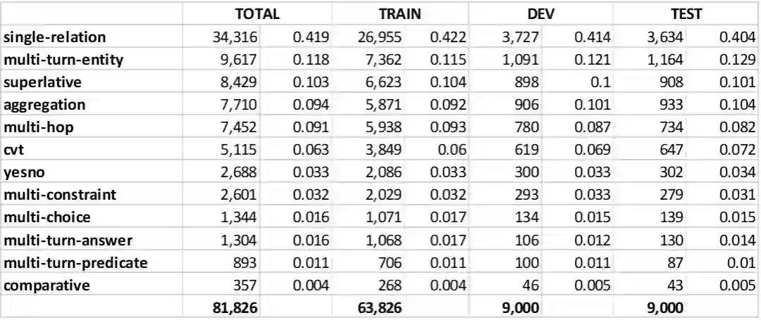 而MSParS基于微软的开放领域知识图谱Satori进行标注,目前发布的V1.0版本总共包含81,826条人工标注,每条数据由一个四元组构成:问题、语义表示、语义表示参数、问题类型。其中,语义表示参数是指在问题中出现的构成语义表示所需的实体名称、实体类型或数值等。问题类型则由9种单轮问题类型和3种多轮问题类型组成,包括单关系(single-relation)、多跳(multi-hop)、多约束(multi-constraint)、复合事件(CVT)、是非判断(yesno)、选择(multi-choice)、最高级(superlative)、数值比较(comparative)、聚集查询(aggregation)、前一轮问题实体省略(multi-turn-entity),前一轮问题谓词省略(multi-turn-predicate)和前一轮答案省略(multi-turn-answer)。