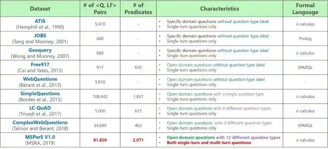针对这些问题,微软亚洲研究院自然语言计算组与微软必应(Bing)搜索引擎团队合作构建并发布了一个大规模、高质量、多类型的语义分析数据集:MSParS (Multi-perspective Semantic ParSing Dataset),希望供科研人员和工业界同行进行研究和使用。该数据集(V1.0版本)包含了81,826个自然语言问题及其对应的结构化语义表示,覆盖12种不同的问题类型和2,071个知识图谱谓词,是学术界目前最全面的语义分析数据集。现在,MSParS V1.0版本已经可以通过GitHub进行下载。