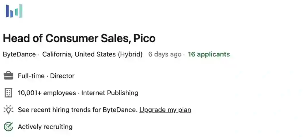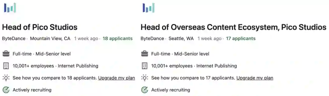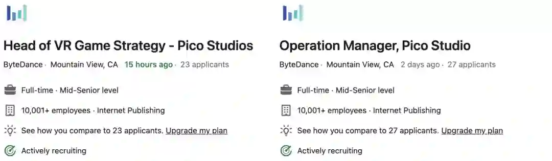 去年收购的Pico如今空出了40多个岗位,大多数岗位空缺都是Pico在西海岸的分支机构需要的。