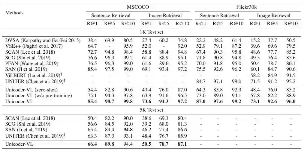 1)图像文本检索。我们选取 MSCOCO 数据集和 Flickr30k 数据集,并分别从图片检索文本和文本检索图片这两个角度评估 Unicoder-VL 在图片检索上的能力。由于预训练数据与这两个图文检索数据集之间的差异,需要在这两个数据集上进行一定程度的微调。所用到的数据构造则与预训练任务3)保持一致:即随机采样负例图片(或文本),让模型判别两者是否匹配。