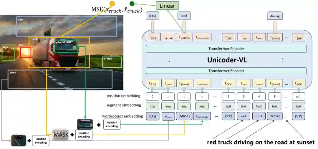 3)图像文本匹配。该任务基于图片-文本对随机采样负样例图片或文本,并让模型判别两者是否匹配。Unicoder-VL 保留了 BERT 中的特殊符号 [CLS]。该符号在最后一层的输出向量经过 MLP 层映射后,直接用于预测输入图文之间的匹配关系。这一任务用于学习图片与文本之间的全局信息对应关系。