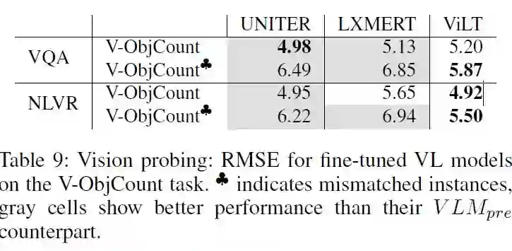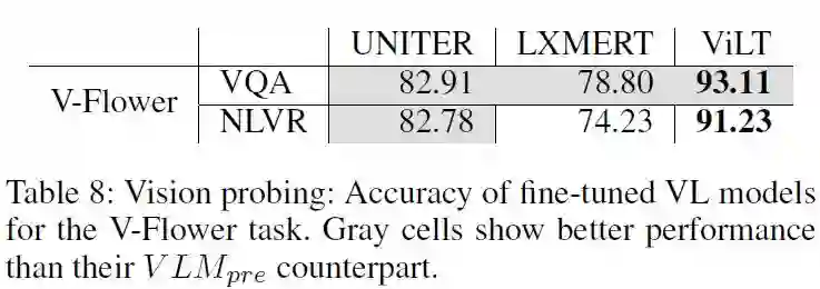 Fine-tuning改善了UMITER和LXMERT的视觉性能。这似乎表明VQA和NLVR依赖视觉信息,而这些信息在预训练模型中不容易获取,同时也表现出两个模型在提取视觉信息上的不足;另一方面Fine-tune并没有提高ViLT提取视觉信息的能力。