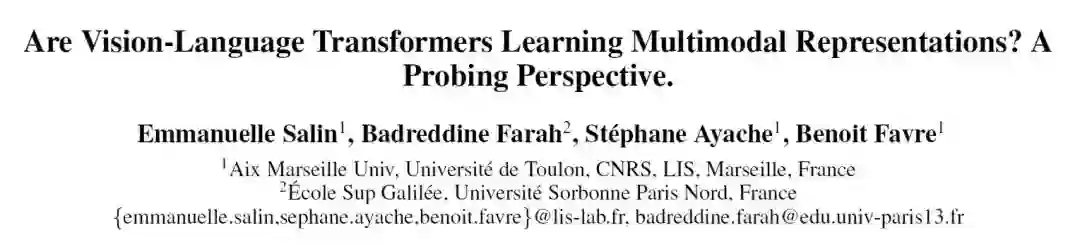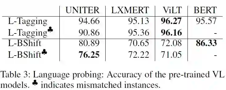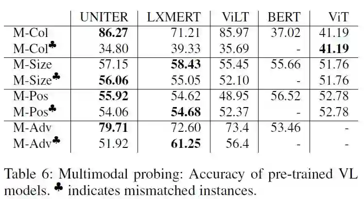 视觉语言任务(如视觉问题回答、跨模态检索或生成)非常困难,因为模型需要建立合理的多模态表征将文本和图片的细粒度元素联系起来。在BERT等基于transformer的语言模型成功后,各种基于transformer的多模态预训练模型(如LXMERT、OSCAR、ViTL等)被提出用于得到文本-图片的多模态表征,并且在多模态任务上达到SOTA。但重要的是要了解多模态信息是如何在这些模型学到的表征中编码的,以及它们是如何受到其训练数据的各种bias和属性影响的。Hendricks & Nematzadeh依靠探索任务来研究多模态预训练模型对动词的理解,并确定模型对动词相关的多模态概念的学习少于主语和宾语的学习。在本文中,作者通过特定的一组探索任务来探究VLM的多模态表征能力以及对单模态信息的偏向性。