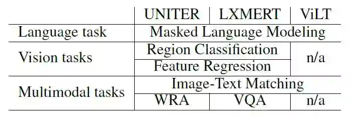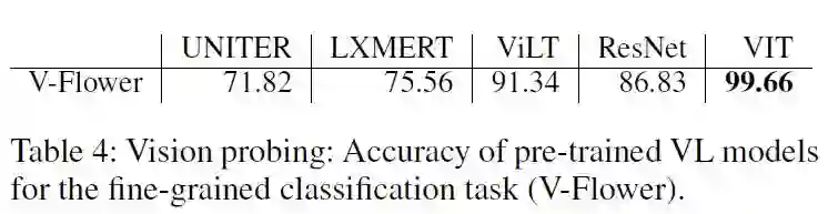 作者选择了三种不同架构且已经预训练好的视觉语言模型:UNITER,LXMERT,ViLT在不同的探索任务上与单模态的SOTA模型进行对比: