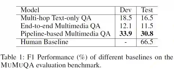 使用图像的QA往往只限于从一组预定义的选项中挑选答案,而这样的多选形式被证明是有显示偏见的。Talmor等人(2021)贡献了一个涉及表格、文本和图片推理的抽取式多跳QA数据集;然而每张图片都与维基百科的一个实体相关联,因此对图片的推理基本可以归结为根据问题对图片进行排名并使用排名靠前的图片对应的实体。目前的多模态基准由于在回答问题时并不要求图像-文本grounding使得模型无法解决需要在图片和文本上进行联合推理的问题。因此,作者提出新的QA评估基准任务——多模态多跳QA,并且设计了自动生成silver-standard训练数据的pipeline。