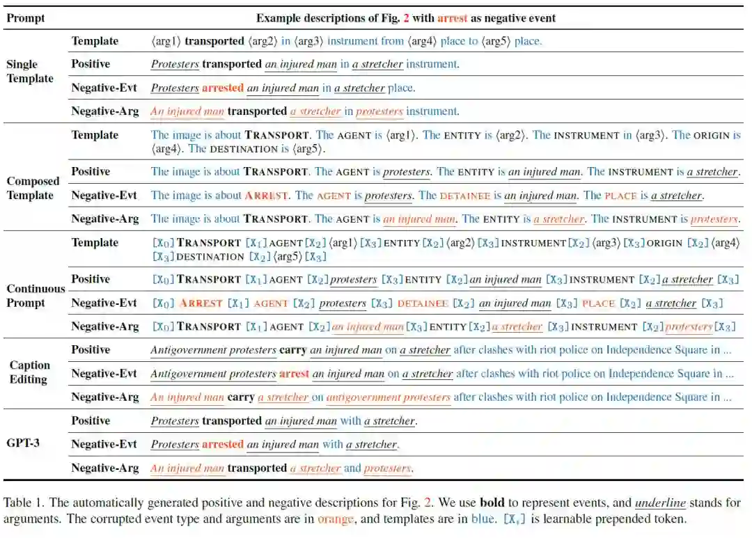 描述生成:为了对提取到的事件结构以及负例事件结构进行encoding,作者设计了多种prompt函数(此处给出生成的例子)