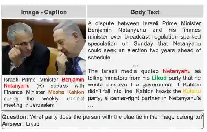 给定带有图像-标题对以及问题的新闻正文,系统需要在正文中找到相应的文本跨度来回答问题。回答问题的过程中,系统需要进行多跳推理:首先进行图片-标题对之间的grounding为与问题中图片相关的部分找到中间答案,称为桥项(bridge item);第二跳是通过中间答案在新闻正文中进行推理,提取文本跨度作为最终答案。例子如下: