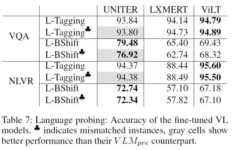 在语言任务上,唯一有提升的是UNITER在负例上的表现,作者将其归结于该模型预训练协议的特殊性。而在NLVR任务上fine-tuned的模型表现出更低的性能可能是因为NLVR任务使用两张图片作为输入,和预训练、探索任务不同;LXMERT经过fine-tuned的性能体现出该模型更容易忘记在预训练阶段学习到的语义知识。