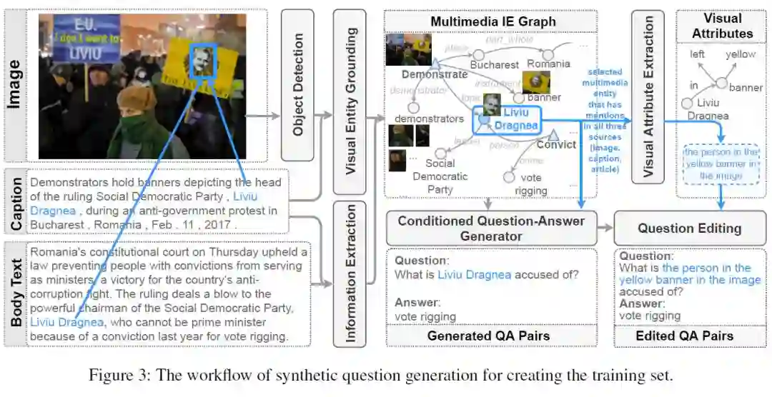 首先通过图片-Caption对之间的Grounding获得图片中Object在Caption中的描述,并对Drounded的图片Object运用视觉属性抽取系统提取相应的视觉属性以便生成对Object的描述。在得到Caption中Grounded的实体之后,先使用SOTA的知识抽取模型对Caption和正文进行相应的实体提交抽取以获得候选的上下文来进行问题-答案对生成。使用带视觉属性的图片Object的描述来替换生成的问题中的Grounded实体对应的文本跨度。最后过滤掉能够被单跳纯文本QA模型回答的数据。