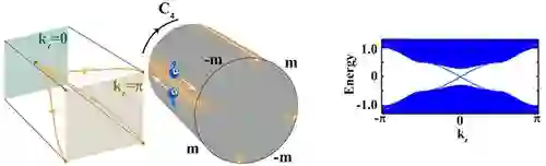 然而,这个态不是拓扑非平庸的:它依然是个原子绝缘体,只是电荷中心与原子位置不重合而已。而后,研究人员把这一思想扩展到三维。考虑一个有四度旋转对称性、时间反演对称性的三维系统,并把z方向(转轴方向)变换到动量空间。其中,kz=0与kz=π两个面都有时间反演对称性,而其它的kz面则没有时间反演对称性。因此,之前对二维系统的讨论仅适用于kz=0与kz=π两个面。于是,人们可以构造这种态:kz=0的二维子系统的电荷中心在原胞中心,kz=π的二维子系统的电荷中心在原胞角上,而0<kz<π的子系统通过一个旋转不变的过程把它俩连起来。在这样的系统中,尽管每个kz子系统都是某种二维原子绝缘体,但由于电荷中心的流动,三维系统则是拓扑非平庸的。在图2(左)中,研究人员画出了这种电荷流。根据这种电荷流,可以推测出如图2(中)所示的一维螺旋态。为了验证这一猜想,研究人员构造紧束缚模型并进行数值验证,在图2(右)展示了在一个方形四棱柱上的一维能带结构,其中的无能隙激发即为一维螺旋态。需要注意的是,这种一维螺旋态不一定出现在棱上:通过加入一个保持四度旋转的扰动项,可以把它旋转到任何位置。因此,即便在如图2(中)所示的光滑表面上,依然有这种一维态。
