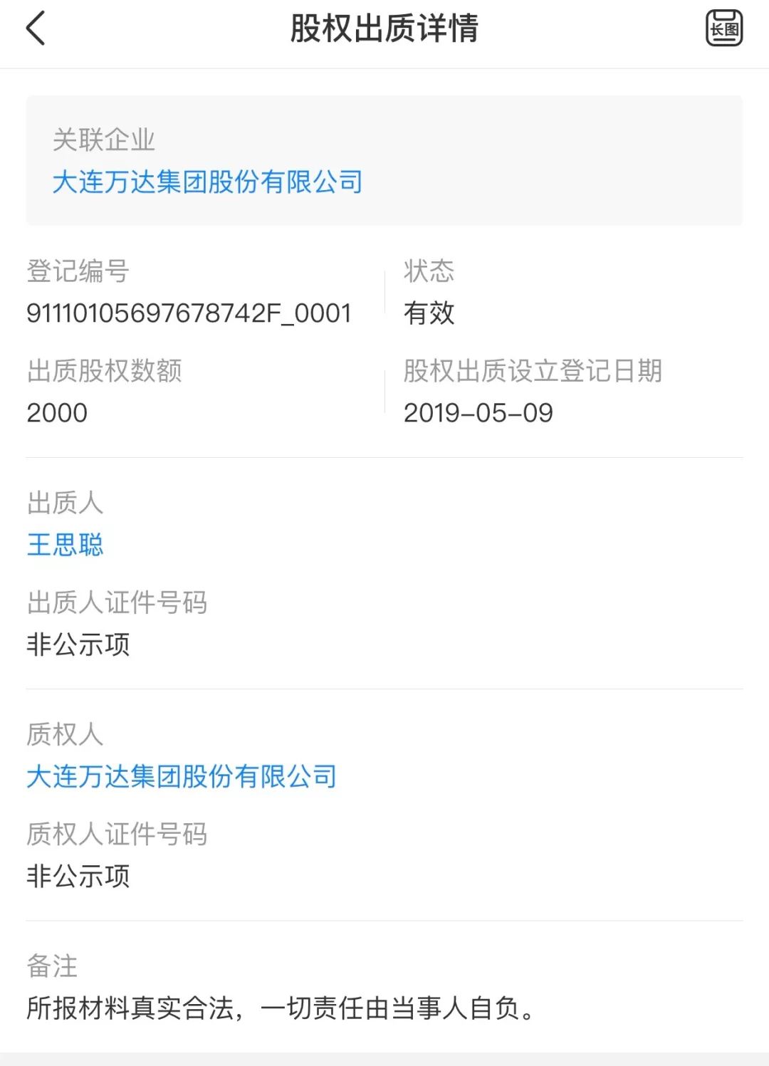中证君发现,王思聪100%持股的“普思资本”,其股权在2019年5月,就质押给了大连万达集团。