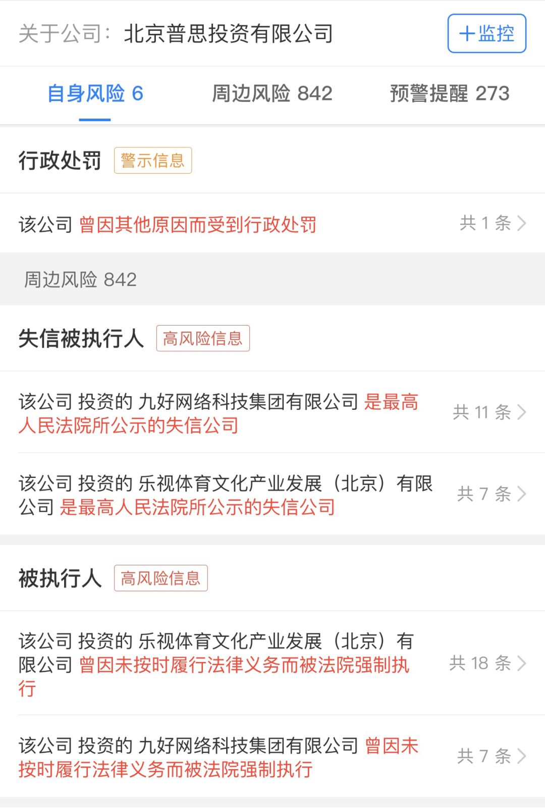 中证君通过查询发现,普思资本所投的两家公司——九好网络科技集团有限公司、乐视体育文化产业发展(北京)有限公司——均为最高人民法院所公示的失信公司。