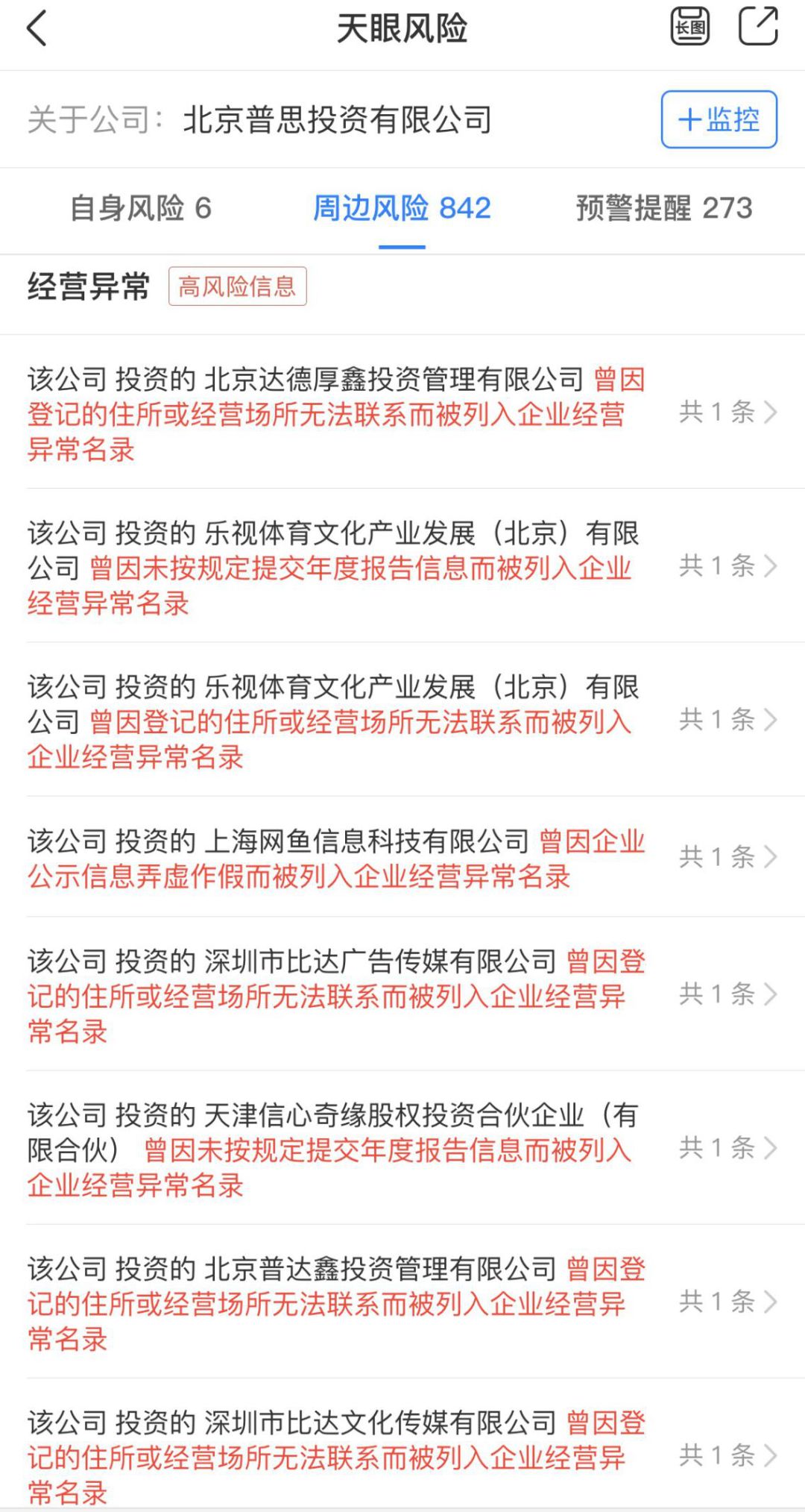 此外,天眼查信息还显示,普思资本所投资的多家公司存在风险。