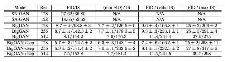 BigGAN-deep 和 BigGAN 在不同分辨率图像上的评估结果对比。