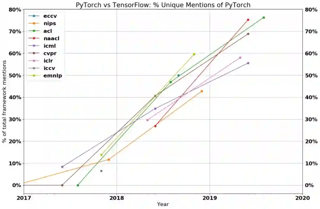 数据表明,在顶级研究会议上,使用PyTorch与Tensorflow的论文之间的比率。所有的线条都在向上倾斜,2019年的每个主要会议大多数论文都使用了Pytorch。