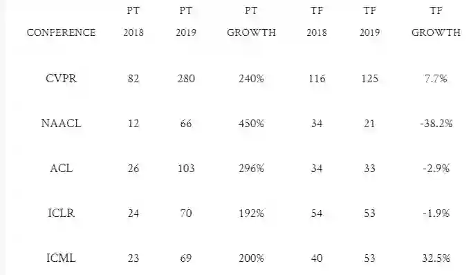 除了ICML之外,没有会议上TensorFlow的增长甚至与总论文数增长保持同步。在NAACL,ICLR和ACL,TensorFlow今年的论文实际上少于去年。