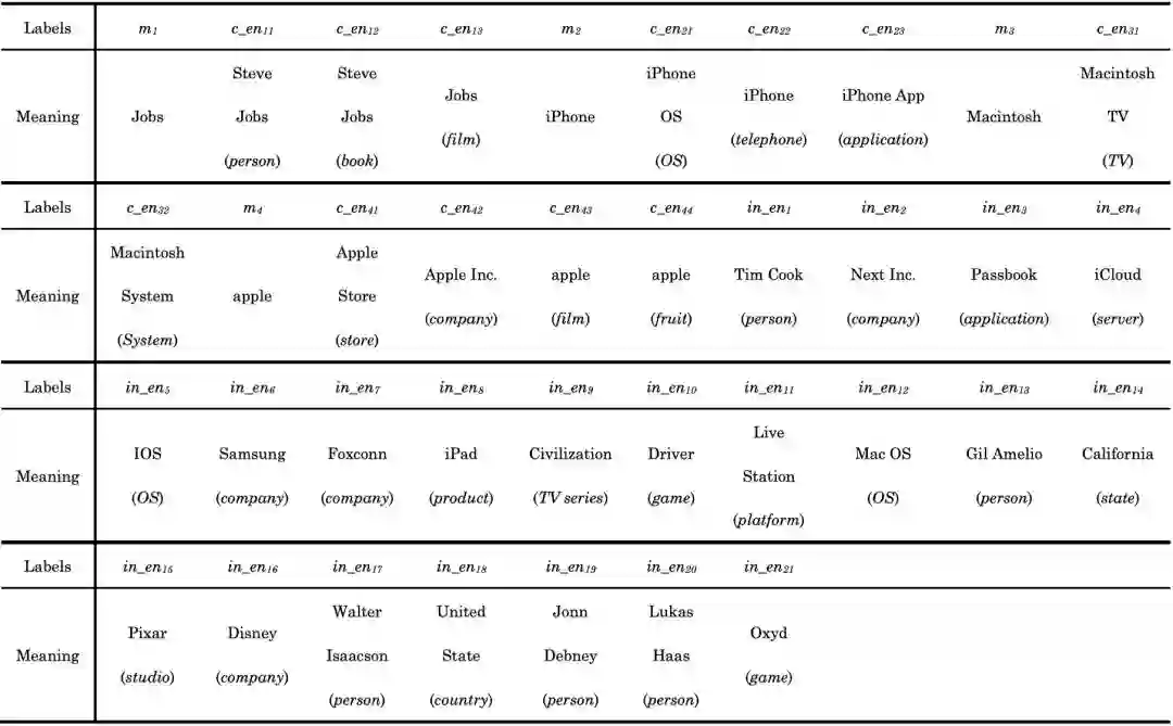 图1是一个实体图的例子。它通过下面的句子构建而来:“人们总是谈论苹果发布的成功产品,例如iPhone。事实上,以麦金托什机为例,乔布斯也会发布不成功的产品。”(“People only talk about the successful products released by Apple, such as iPhone. In fact, taking Macintosh as example, Jobs also produced many unsuccessful products.”)这句话里有四个名称指称(通过预处理过程提取出四个名称指称,在预处理过程中,一些常见的指称不会被提取出来,比如“人们”和“产品”),已加粗标示。每一个名称指称都具有一个候选实体集,为了简化图的表示,我们使c_en**代表一个候选实体,并且使in_en**代表一个中间实体(或者一个中间节点),表1列出了名称指称的实际意义和对应的候选实体。在图1中,一个椭圆包含了一个名称指称的全部候选实体。例如,c_en11, c_en12, c_en13都是m1的候选实体。两个在DBpedia中直接相连的实体,在图中用一条边直接连接。每一条边均有一个标记集。此集合包含通过这条边的所有路径能连接的所有候选实体。例如边(in_en3,in_en4)的标记集为{c_en13,c_en21,c_en42}。这些候选实体所对应的结点可以被穿过(in_en3,in_en4)的路径连接在一起。此标记集合可以用来计算图中边的权值。