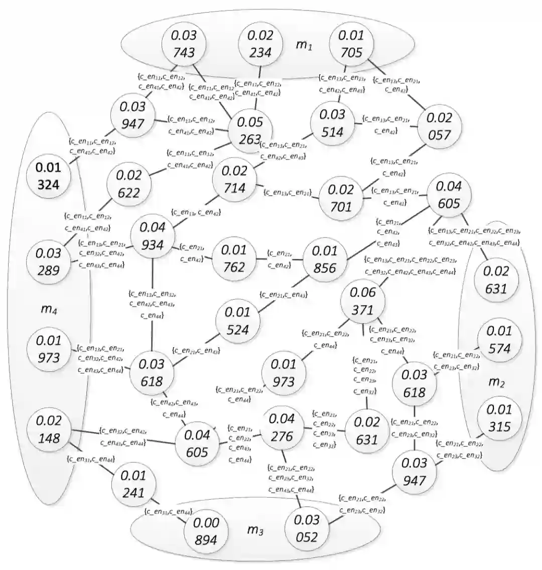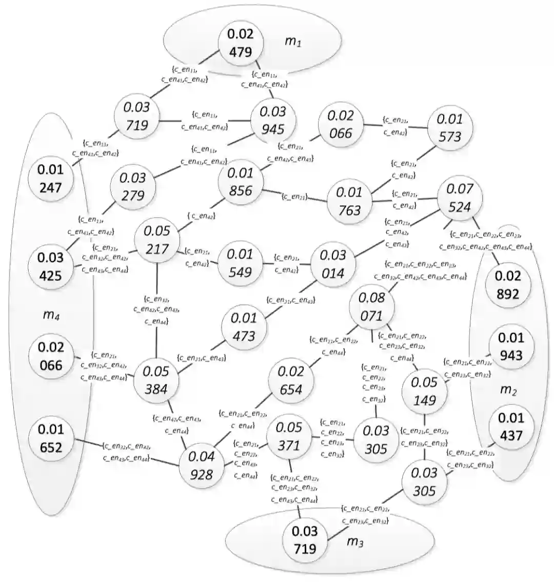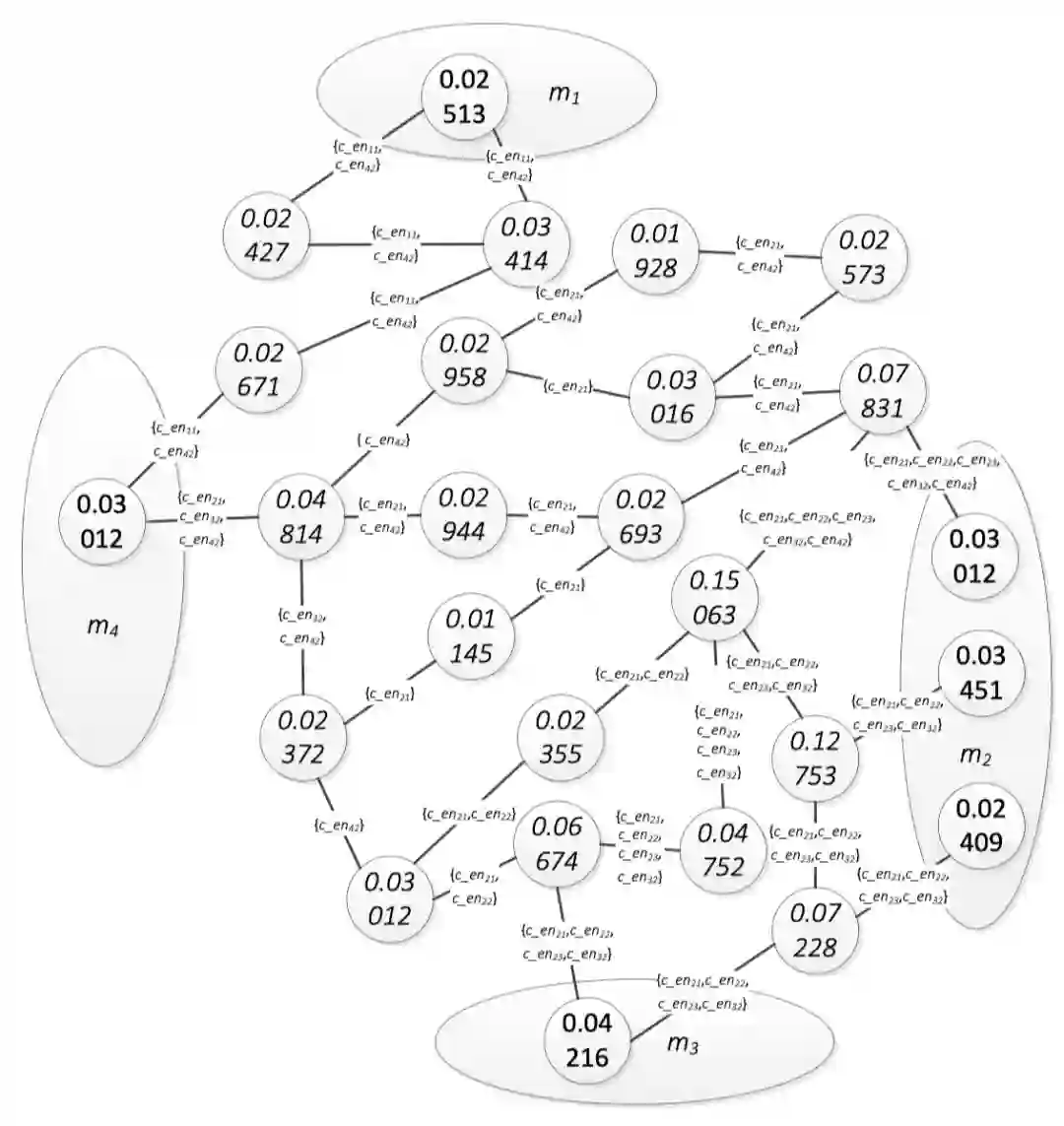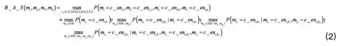 既然四个名称指称(i.e. m1, m2, m3, m4)在上下文中共现,那么可以假设这四个名称指称是相关的。本文使用一个联合概率分布来函数来计算将每一个候选实体分别分配给每个指称的联合概率。