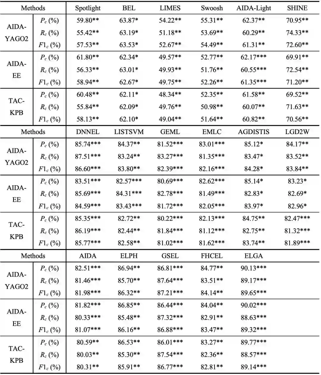 以下实验将我们的链接算法和不同的基线算法在准确度和运行时间上做比较。基线算法包含实体对实体(entity to entity)的方法,例如Spotlight [3],BEL [23],LIMES [15],Swoosh [1]和AIDA-Light [16];基于机器学习的方法,例如SHINE [19],DNNEL [5],LISTSVM [10]和GEML [22];基于集体实体链接的方法,例如EMLC [6],AGDISTIS [20],LGD2W [17],AIDA [7],ELPH [4],GSEL [2],和FHCEL [11]。在表2和表3中,把本文提出的算法称为(ELGA)。所有的基线算法都在都在一个具有2.4G Hz CPU和16G内存的电脑上运行。