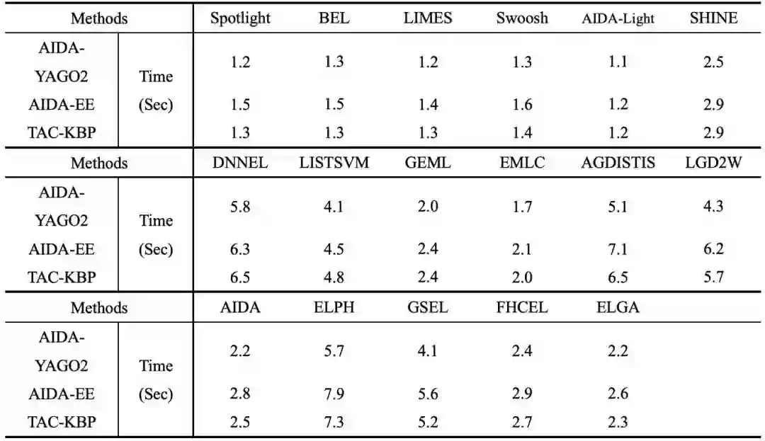 通过观察表2和表3,可以很容易看出实体对实体的方法比其他方法运行速度要快很多。事实上,实体对实体方法就是为线上使用特别设计的。为了减少运行时间,这类方法引入了一些限制。例如,LIMES需要相似度满足三角不等式,Swoosh需要相似度满足偏序。由于这些限制,实体对实体方法可以大幅度缩减运行时间。以AIDA-Light为例,它只需要1秒钟就可以处理1个名称指称。而另一方面,因为它们从不考虑实体之间的关系,而且一些限制在实际应用中过于严格,所以它们的准确度非常低。正是由于此原因,它们的F1值也很低。相反的,基于集体链接的方法在所有测试集上都具有较高准确度。这是由于基于集体链接的方法构建了一个可以捕获实体之间关系的图,并且在图中不具有额外的限制。因此,具有很高的准确度。然而,基于集体链接的方法需要为图中的节点赋权(EMLC和AGDISTIS),或分析图的结构 (ELPH,GSEL和FHCEL),或将实体之间的关系整合到一个目标函数中(LGD2W和AIDA)。这些过程都是耗时的。EMLC和AIDA试图通过减少图的规模来减少运行时间,FHCEL使用爬山优化算法来解决NP问题,然而这些方法都会降低准确度。基于机器学习的方法取得的效果介于实体对实体方法和基于集体链接的方法之间。原因是基于机器学习的方法收集名称指称的上下文作为训练语料,训练了一个分类器来区分候选实体。此方法可以最大程度地应用名称指称上下文中的有用信息。例如名称指称的位置、名称指称的长度以及名称指称的词性等。基于此,基于机器学习的方法比实体对实体的方法具有更高的准确度,但是同样由于基于机器学习的方法没有考虑实体之间的关系,它的准确度要比基于集体链接的方法低。至于训练时间,既然基于机器学习的方法有一个训练过程并且这个过程是很耗时的,它的运行时间比实体对实体的方法要长。和基于集体链接的方法比较,基于机器学习的方法的训练过程只对一个实体进行。因此它们的运行时间比基于集体链接的方法的运行时间要短。在基于机器学习的方法中有一个例外,那就是DNNEL。这个方法将名称指称的稀疏上下文向量通过神经网络转化为稠密的向量,此向量可以在一定程度上反映实体之间的关系。但是这种转换是非常费时的,因此虽然DNNEL耗时很长,但它拥有和基于集体链接的方法类似的准确度。我们的算法(ELGA)也是一种基于集体链接的算法,并且它通过用路径连接所有相关的候选实体来构建了一个相对完整的实体图。基于实体图我们提出了一个基于概率的目标函数,这个目标函数考虑了实体之间的关系以保证获取精确的链接结果。除此之外,如表2所示,我们的链接算法在三个测试集上的显著性测试结果都达到了0.01水平。这意味着我们的链接算法比其它基线算法表现得更加出色。关于运行时间,由于我们的算法采用贪心策略和调整过的蒙特卡洛随机游走来加快速度,使得算法比其他的基于集体链接的算法的运行时间更短,它甚至短于一些基于机器学习的方法的运行时间,与实体对实体的方法接近。