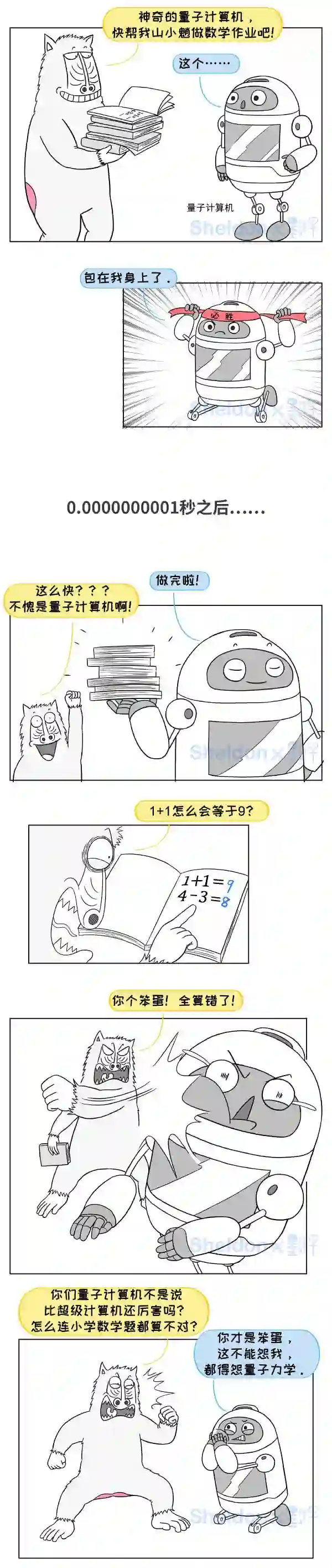 想想看,物理学家常常让1个粒子携带1个量子比特,而我们周围的环境里动不动就是有10²³个粒子,随便让其中一个粒子撞一下,量子计算可能就出错了。就算将粒子周围的环境抽成真空,再降低到绝对零度附近,环境里还是会有大量的粒子,它们想要干扰1个粒子的运动还是太容易了。于是,量子比特只要稍微受到一点儿干扰,整个运算就会出错了。