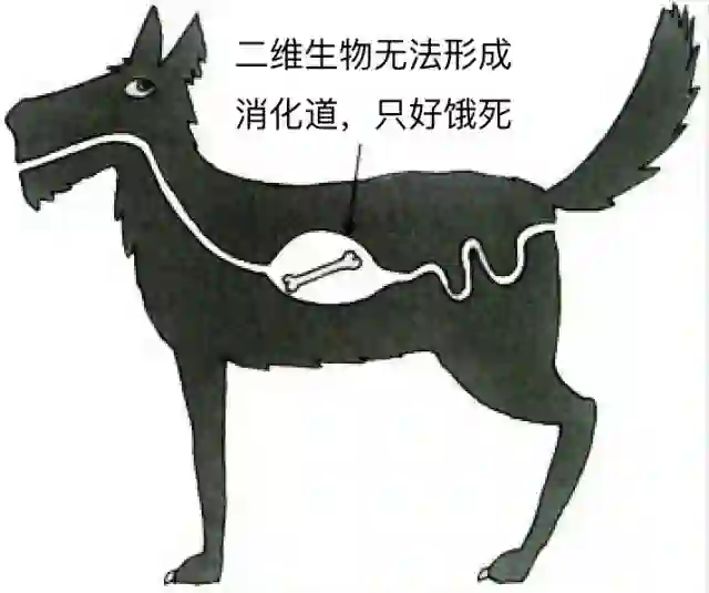 6. 任意子不可能存在于三维空间中,它只可能存在于二维平面,或者原子排列成的甜甜圈的二维表面上。这就好比动物只能活在三维空间中,不可能活在二维空间中,如下图。