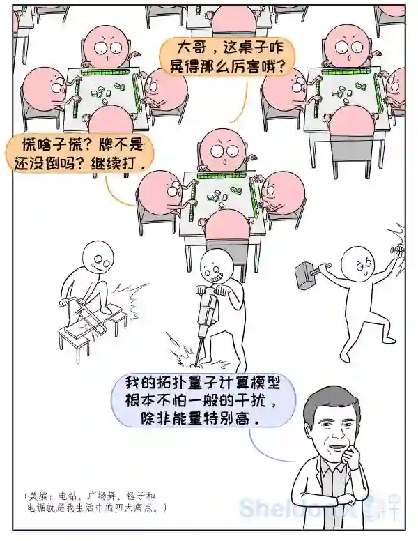 2. 这就好比修了一幢大楼,一楼有4个房间(用于量子计算),二楼的高度相当于其他大楼的100楼(二楼相当于量子计算出错的状态)。如果你让粒子构成的整体状态待在一楼做量子计算,就算有人带着能量来打扰,它们也不容易随随便便就跑到二楼(相当于其他大楼的100楼的高度)去。