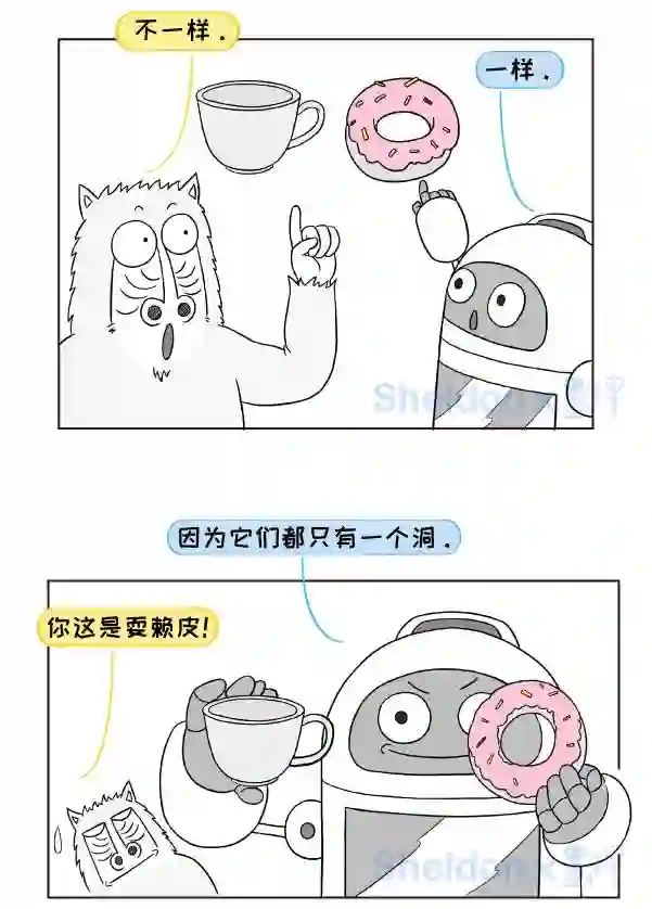 拓扑学家根本不关心一个东西的形状到底是方的还是圆的,是软的还是硬的,是粗糙的还是光滑的。他们总是关心一件事,这个东西上面到底有几个洞。