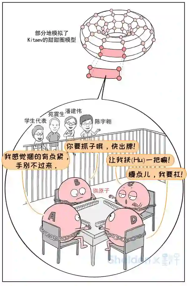 5. 为啥漫画里打麻将的4个原子被绑在椅子上,周围还有墙呢?这是为了阻止它们随便“互换座位”,也就是不得发生“两体相互作用”。Kitaev模型中原子的实际的情况也是这样的,如下图: