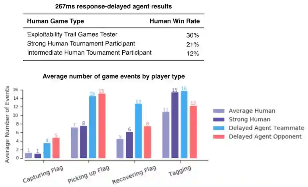 人类玩家面对响应延迟的智能体的胜率仍然很低,这表明,即使被加上了与人类相当的反应延时,智能体的游戏表现依然胜过人类玩家。此外,通过查看人类和相应延时的智能体的平均游戏事件数量,双方的标记事件数量差不多,表明这些智能体在这方面没有占据优势。