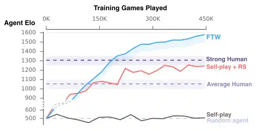 智能体在训练期间的游戏表现。我们训练的新智能体FTW游戏模式下的Elo得分比人类玩家和自游戏+ RS、自游戏的基线方法更高,该分数反映出游戏获胜的概率。