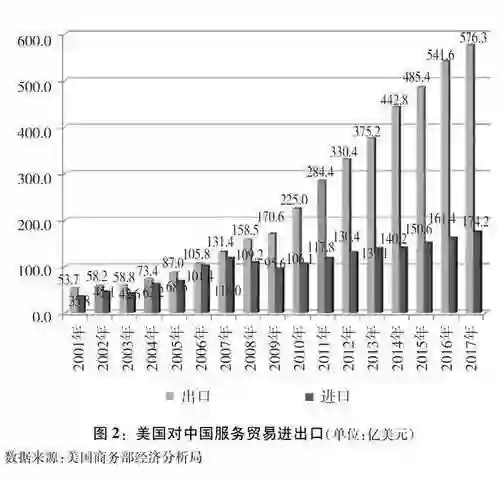 据美国方面统计,2007-2017年,中美服务贸易额由249.4亿美元扩大到750.5亿美元,增长了2倍。2007-2017年,美国对华服务出口额由131.4亿美元扩大到576.3亿美元,增长了3.4倍,而同期美国对世界其他国家和地区的服务出口额增长1.8倍,美国对华服务贸易年度顺差扩大30倍至402亿美元。