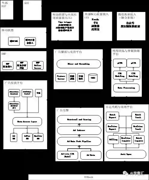 这些数据是用户在系统某一个时间点的切片,他们在时间轴上是不一样的,所以需要有一个系统把所有的数据对齐,我们把它称为日志处理平台。它将数据反馈到模型训练平台,这里可以利用数据进行学习和预测。广告系统还有垂直的业务,比如DMP数据管理平台,在这里广告主可以上传自己的用户数据,和腾讯内部的用户数据做一个交叉分析,得出他感兴趣的人群。