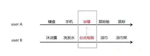 这是两个用户userA,userB在易购上面的消费time line,灰色方框内为我们观察对象,试问一下,如果换一下灰色方框内的userA、userB的购买物品,直观的可能性有多大?