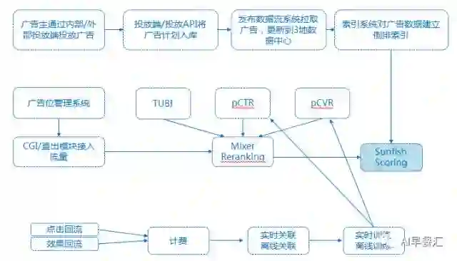Mixer将流量端用户标识扩展出用户画像后,会请求检索系统,我们会把它和广告数据关联起来运算。对于检索系统的返回,对每个广告会请求点击率预测和转化率预测服务,利用这些预测的值乘上广告的出价,形成一个打分叫做ECPM,用它进行排序,形成最有价值的广告返回给流量侧。