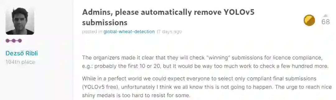 有些人在比赛中使用YOLOv5,那么对其他人是不公平的。虽然比赛结束了,但事件还是愈演愈烈,于是Kaggle 官方10个小时前发布帖子说: