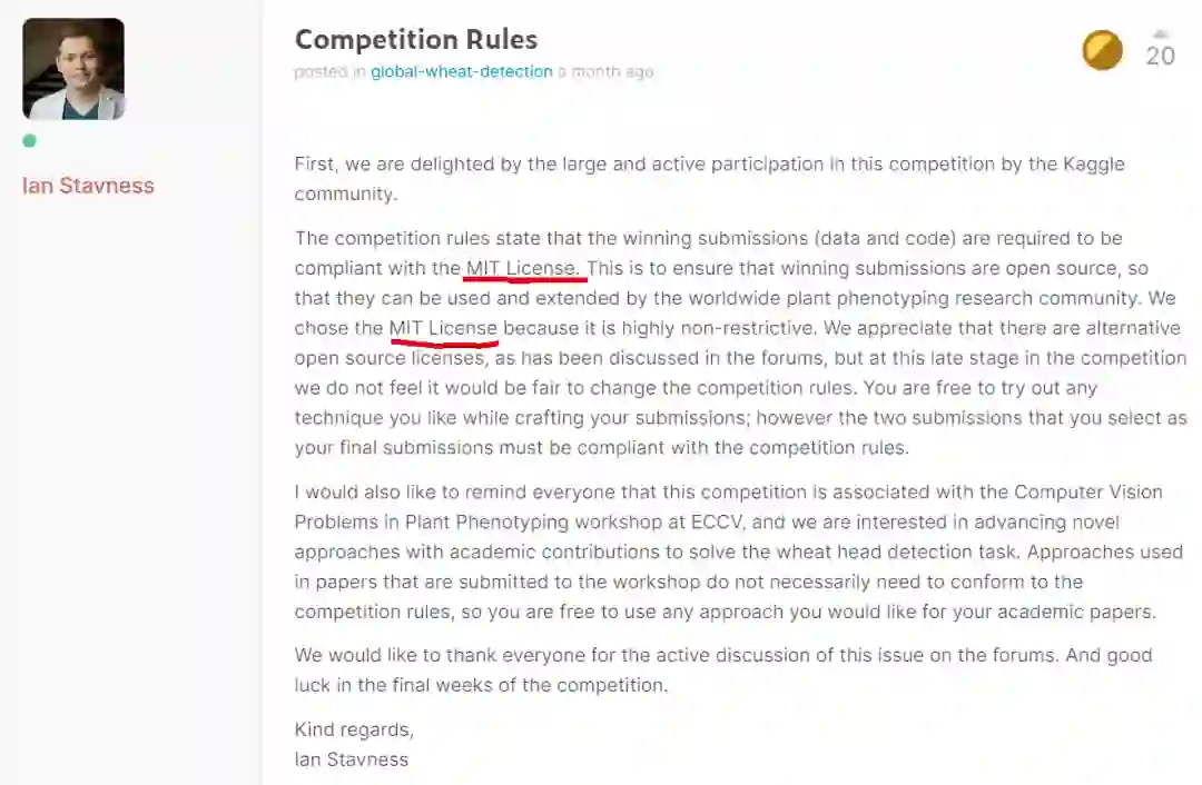 YOLOv5 霸榜一时,Kaggle 官方团队也注意到了这个事情,给出了他们的反馈【Competition Rules】,在规则中,强调了必须遵守 MIT License!