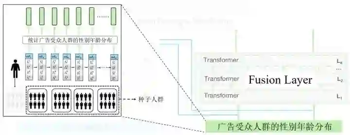 把点击广告的受众人群性别年龄分布融入到网络之中,具体的做法是把人群分为五个部分,假设用户点击n个广告并来自第一个人群,那么可以把剩下的作为种子人群,计算出每个广告的性别年龄概率分布,用四层的transformer进行融合。