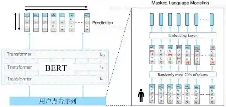 具体地,我们随机mask掉20%的token,mask后的位置使用0向量来代替,或者采样一个属性id来替换。使用改进的MLM预测这些广告的时候,不仅可以使用最近点击的广告,也可以用它的属性去预测,使得不同属性的embedding能够在语义空间上对齐。同时,我们也采用了一个很关键的策略,我们把词表缩小到10万(提取top10w,其余为unk),这样使得bert能跑起来。对于原始的MLM,我们也尝试过,虽然有提高但提高不是很大。