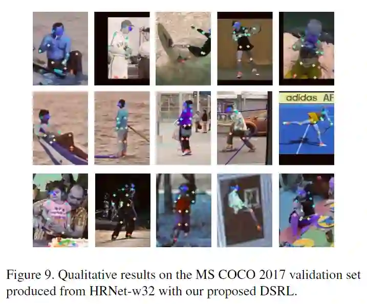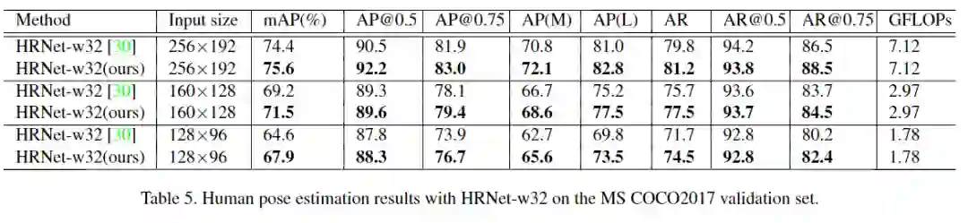 表5总结了baselineHRNet方法和所提出的DSRL方法之间的性能比较。以不同的分辨率作为输入,本文的方法始终超过HRNet 1.2%至3.3%。