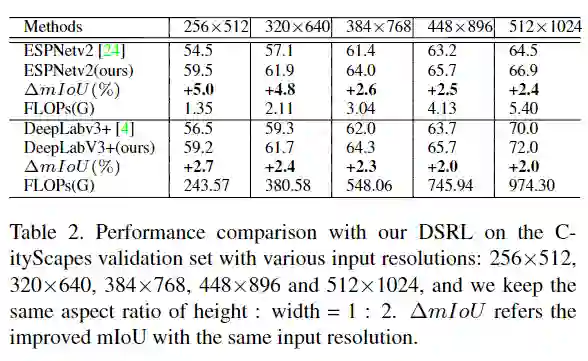 在分别代表轻量级网络和大型网络的ESPNetv2和DeepLabv3 +上进行了实验,并在Cityscape验证集上评估了mIoU。将图像的尺寸调整为256×512,作为加速实验训练的输入。如表1所示,以ESPNetv2为例,可以看到SSSR可以将性能从54.5%提高到55.7%,因为它减少了ground truth的定标时间。通过添加SISR分支,可以将mIoU有效提高2.4%。在结合FA损失的同时,性能可以进一步提高到59.5%(比baseline高5.0%),因此表明在SISR和SSSR之间传输结构信息是必要的。DeepLabv3 +上的结果也可以得出相同的结论,这始终证明了所提出的DSRL的有效性。