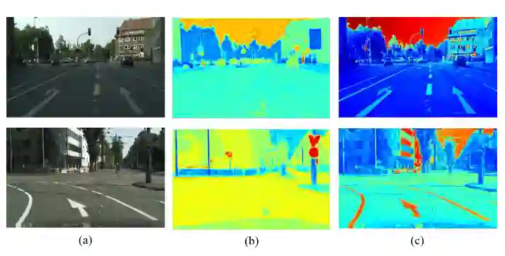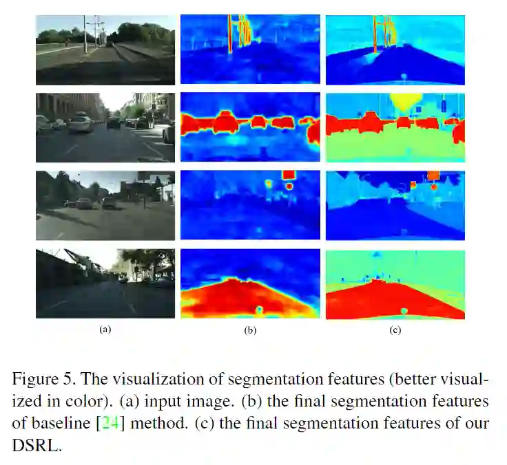 为了更好地理解DSRL,还可视化了baselineESPNetv2和DSRL之间的最终分割特征。如图5(c)所示,本文的方法可以显著提高边界的清晰度,并改善道路,汽车等不同类别的完整性,从而无疑增强了模型的最终判别能力。