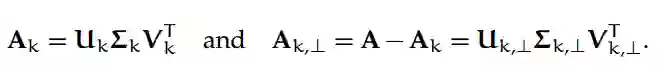 我们会经常使用这些符号:让 U_k ∈ R^m×k(或 V_k ∈ R^n×k)表示矩阵 A 的最前 k 个左(或右)奇异向量的矩阵;让 Σ_k ∈ R^k×k 表示包含 A 的最前 k 个奇异值的对角矩阵。同样的,让 U_k,⊥ ∈ R^m×(ρ−k)(或 V_k,⊥ ∈ R^n×(ρ−k))表示 A 的底部ρ-k 个非零左(或右)奇异向量的矩阵;然后令Σ_k,⊥ ∈ R^(ρ−k)×(ρ−k) 表示包含 A 的底部ρ-k 个奇异值的对角矩阵。然后,