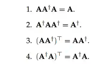 对于非方矩阵而言,其逆矩阵是没有定义的。而一种非常出名的推广型矩阵求逆方法 Moore-Penrose 伪逆在这类问题上取得了一定的进展。形式上来说,若给定 m×n 阶矩阵 A,那么如果矩阵 A† 满足以下属性,它就是矩阵 A 的 Moore-Penrose 伪逆:
