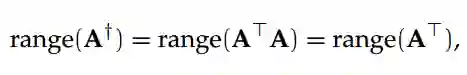 (我们强调秩相等的条件是非常重要的:因为两个矩阵相乘的逆总是等价于矩阵逆的相乘,但这个推断对于一般的 Moore-Penrose 伪逆 [9] 是不满足的)此外,Moore-Penrose 伪逆的基空间和所有实际的矩阵都有联系。给定一个矩阵 A 和 A 的 Moore-Penrose 伪逆 A†,A†的列空间可以定义为: