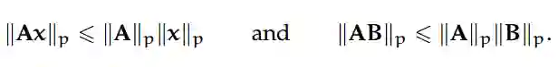 这一系列的范数被称为「归纳(induced)」,因为它们是通过不取决于 A 和 p 的非零向量 x 而实现的。因此,一般存在一个单位范数向量(p-范数中的单位范数)x 令||A||p = ||Ax||p。归纳矩阵 p-范数遵循以下 submultiplicativity 法则: