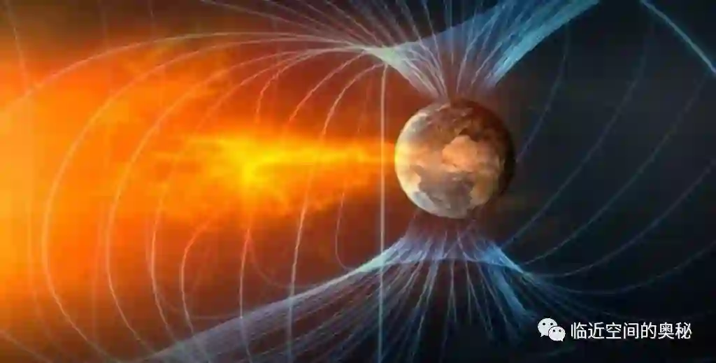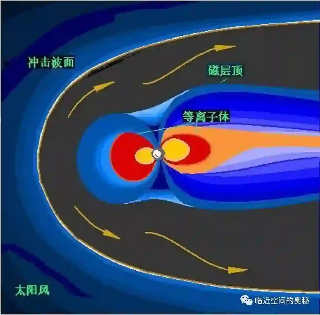 因为太阳风是一种等离子体,所以它也有磁场,太阳风磁场对地球磁场施加作用,好像要把地球磁场从地球上吹走似的。尽管这样,地球磁场仍有效地阻止了太阳风长驱直入。在地球磁场的反抗下,太阳风绕过地球磁场,继续向前运动,于是形成了一个被太阳风包围的、彗星状的地球磁场区域,这就是磁层。