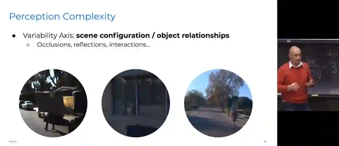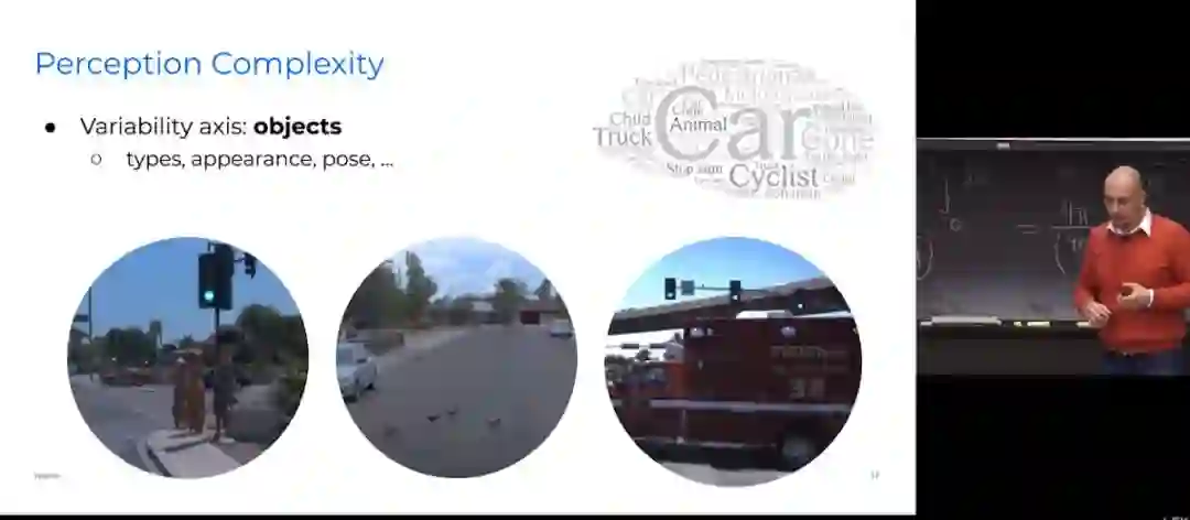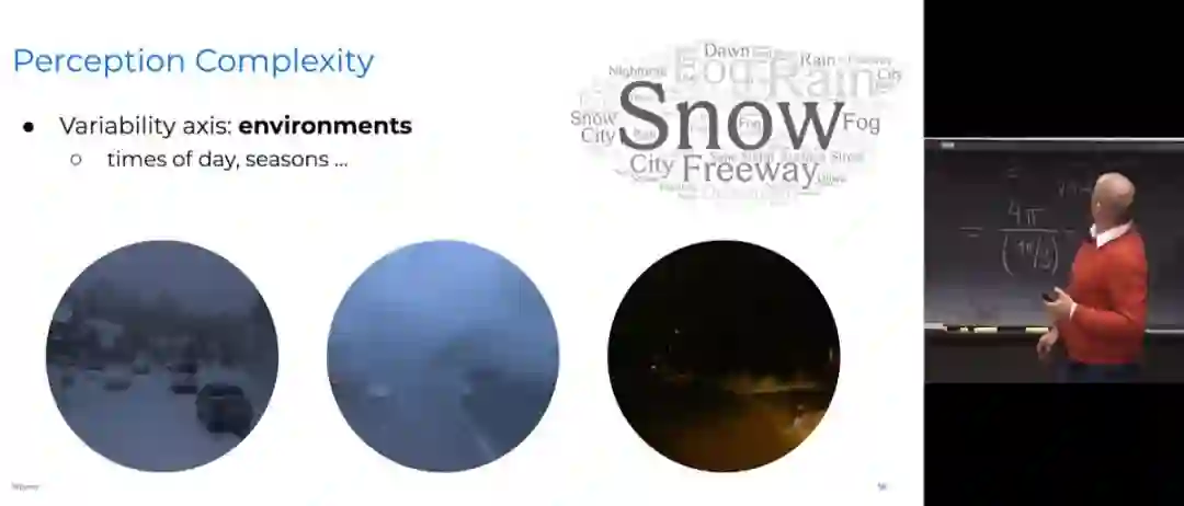 感知的复杂性还包括,很多不同的环境。比如,一天当中不同的时间段(白天/黑夜),不同的季节,不同的天气下雨或者下雪。这些都需要识别。
